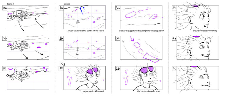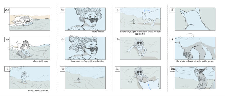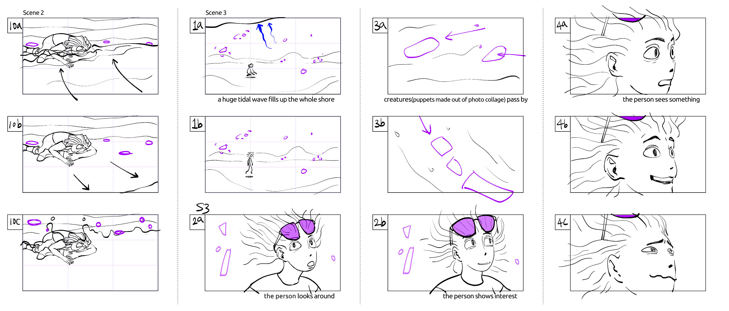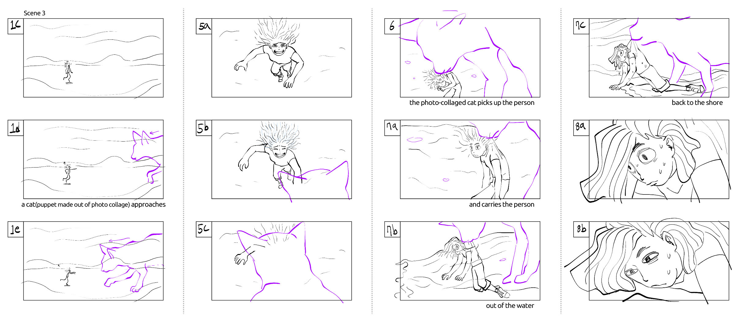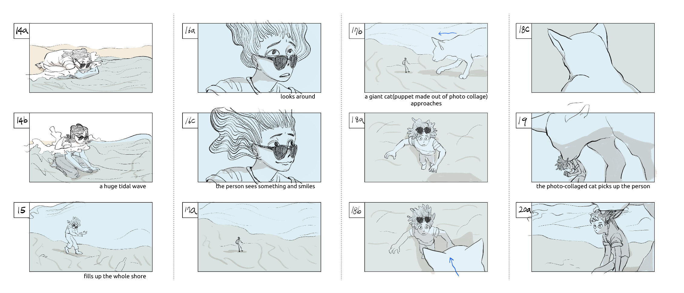 I had 1-on-1 meetings with 3 professors with the first storyboard. From two of the professors, I got feedback that a giant cat appearing at the bottom of the water might confuse viewers. They suggested me to have the cat appear from the beach side, or have an ocean animal save the person instead of the cat. The other professor suggested that I explore surrealism in my project, since photo collage was in a very close relationship with surrealism.