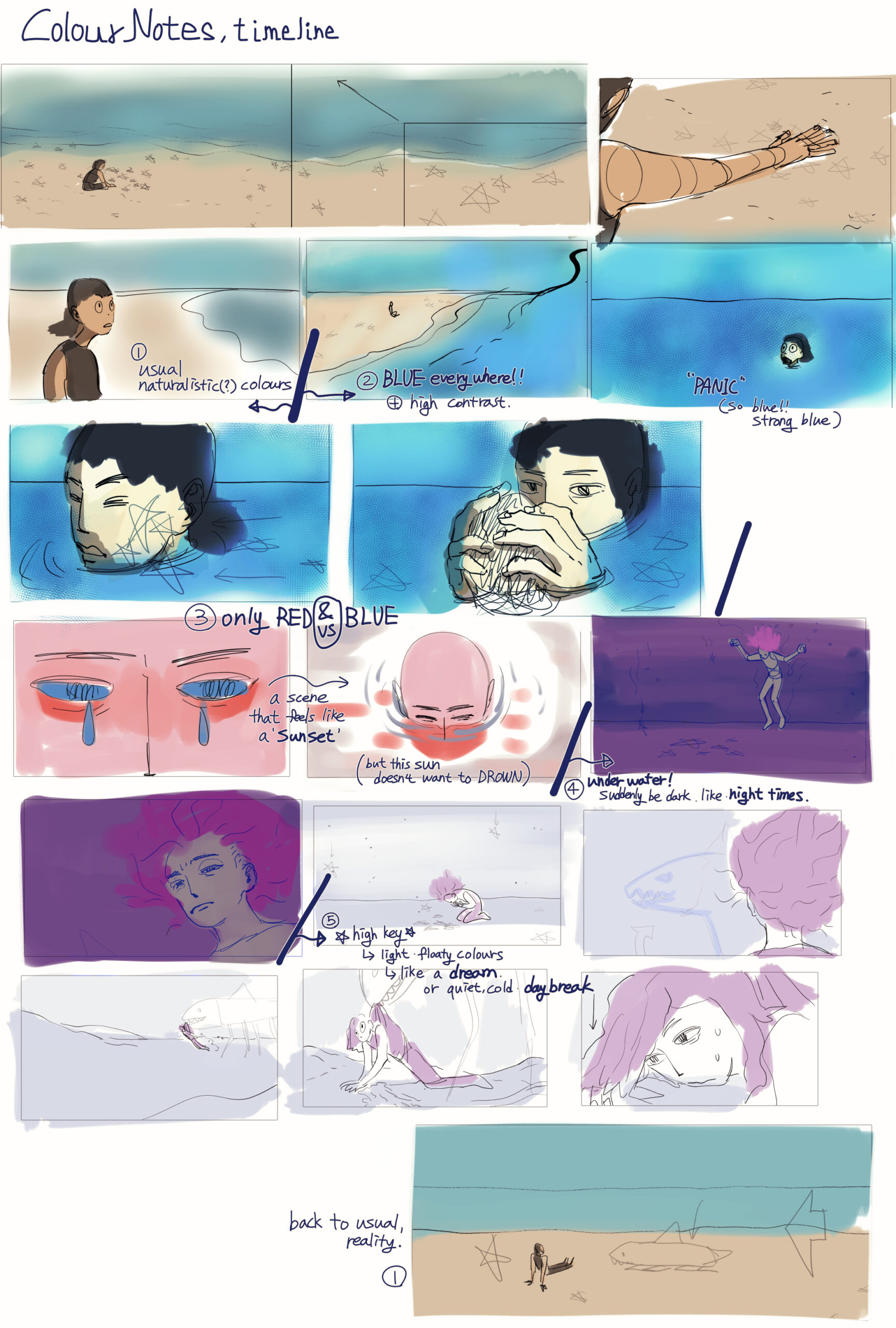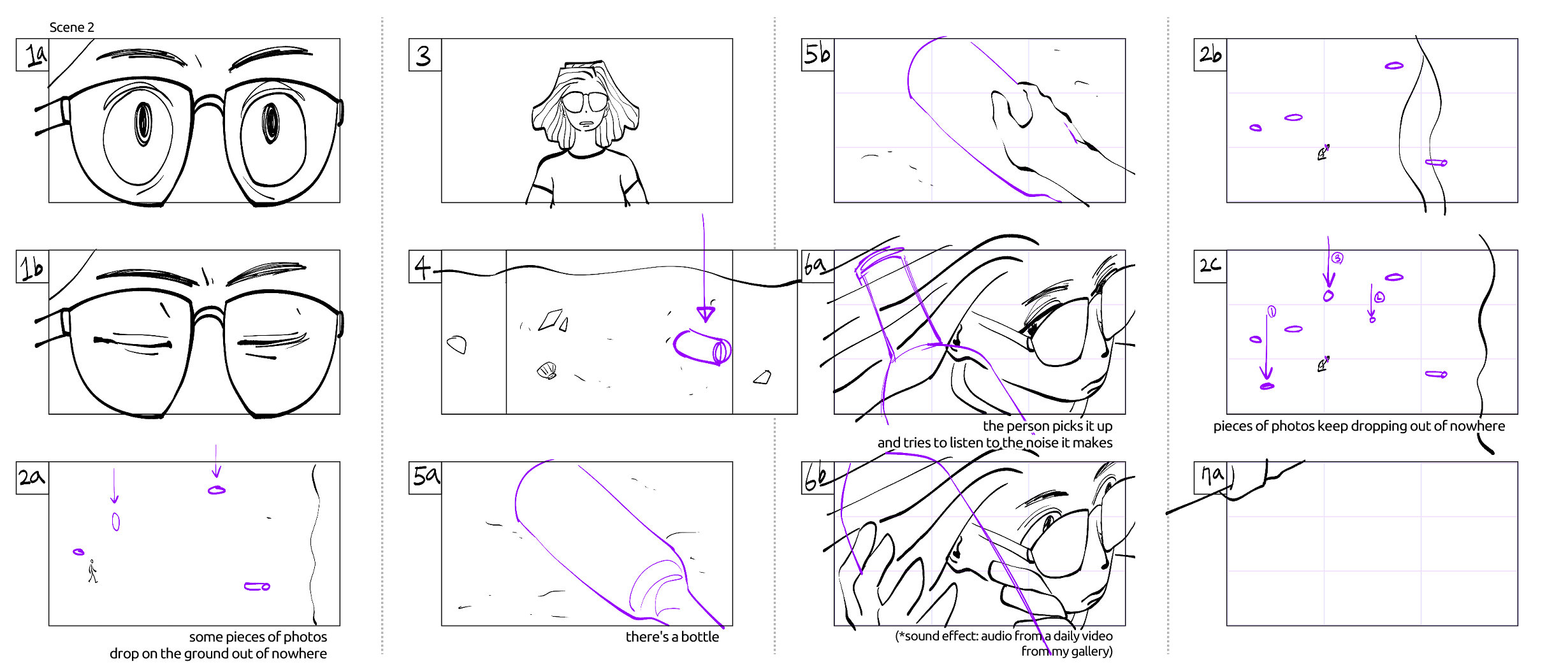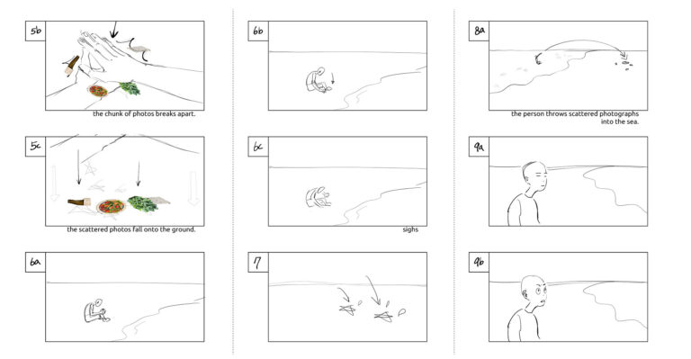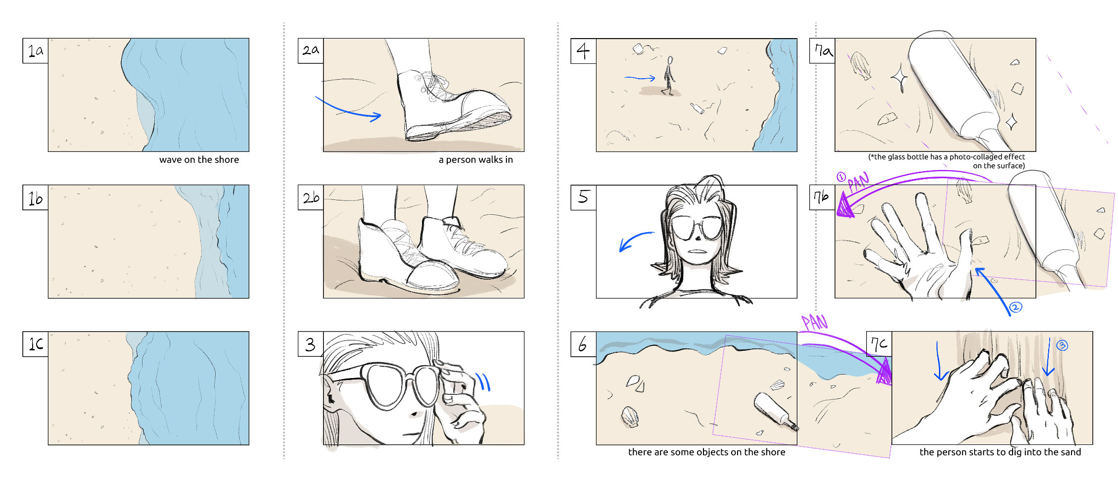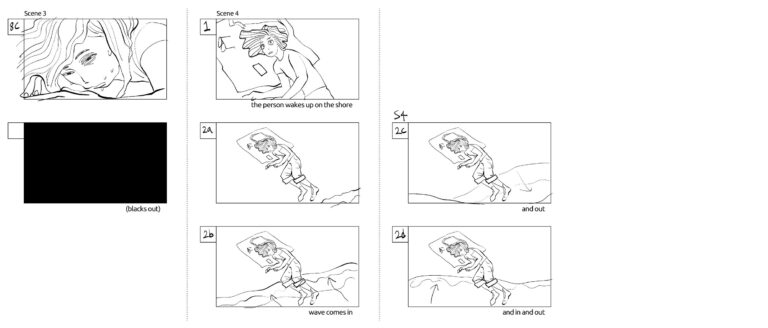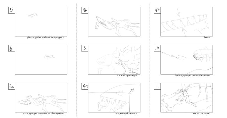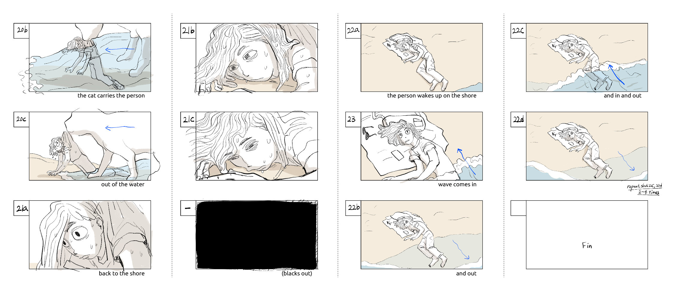 I had 1-on-1 meetings with 3 professors with the first storyboard. From two of the professors, I got feedback that a giant cat appearing at the bottom of the water might confuse viewers. They suggested me to have the cat appear from the beach side, or have an ocean animal save the person instead of the cat. The other professor suggested that I explore surrealism in my project, since photo collage was in a very close relationship with surrealism.