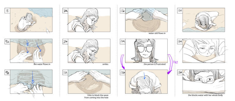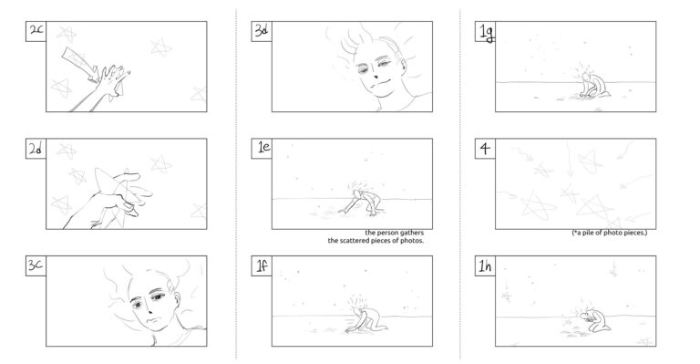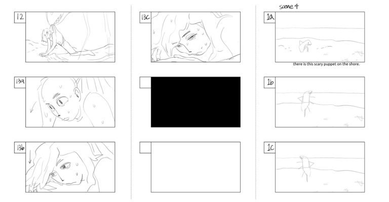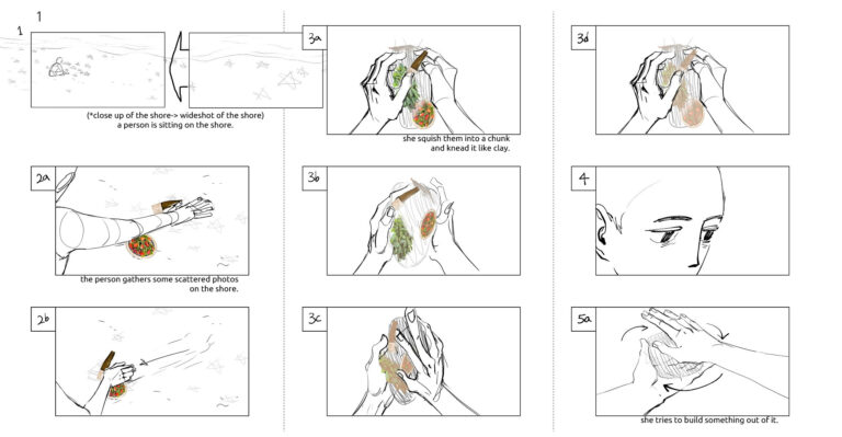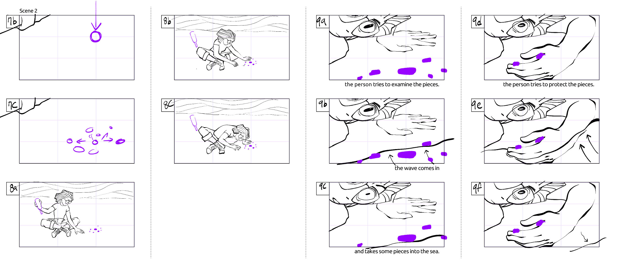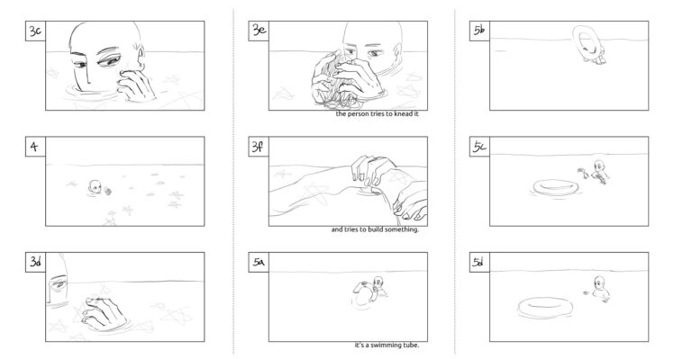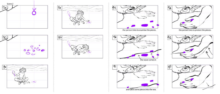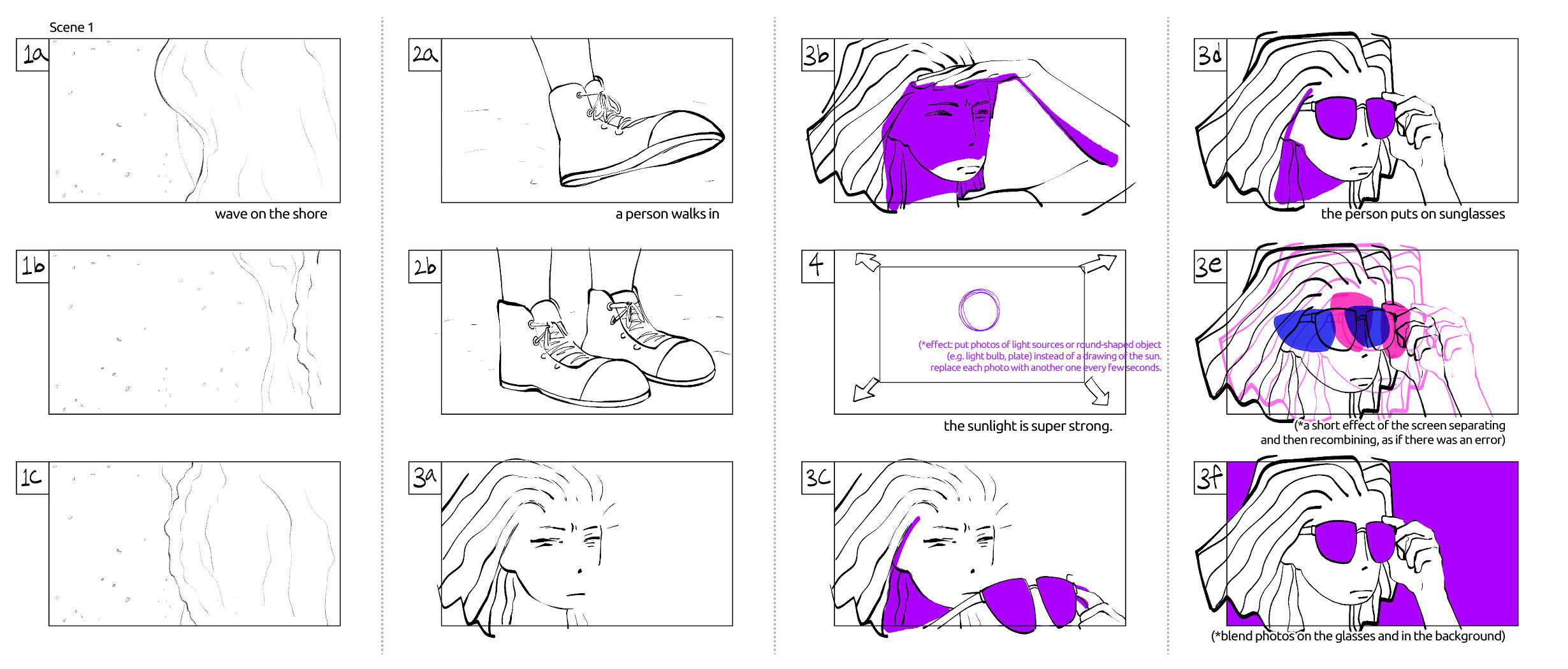 I had 1-on-1 meetings with 3 professors with the first storyboard. From two of the professors, I got feedback that a giant cat appearing at the bottom of the water might confuse viewers. They suggested me to have the cat appear from the beach side, or have an ocean animal save the person instead of the cat. The other professor suggested that I explore surrealism in my project, since photo collage was in a very close relationship with surrealism.