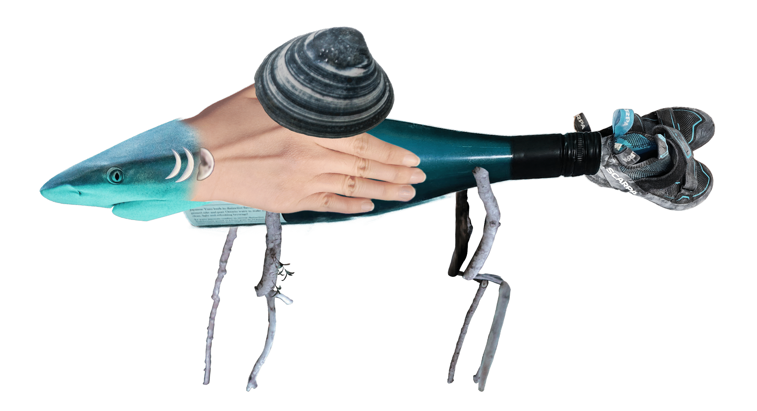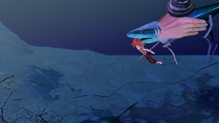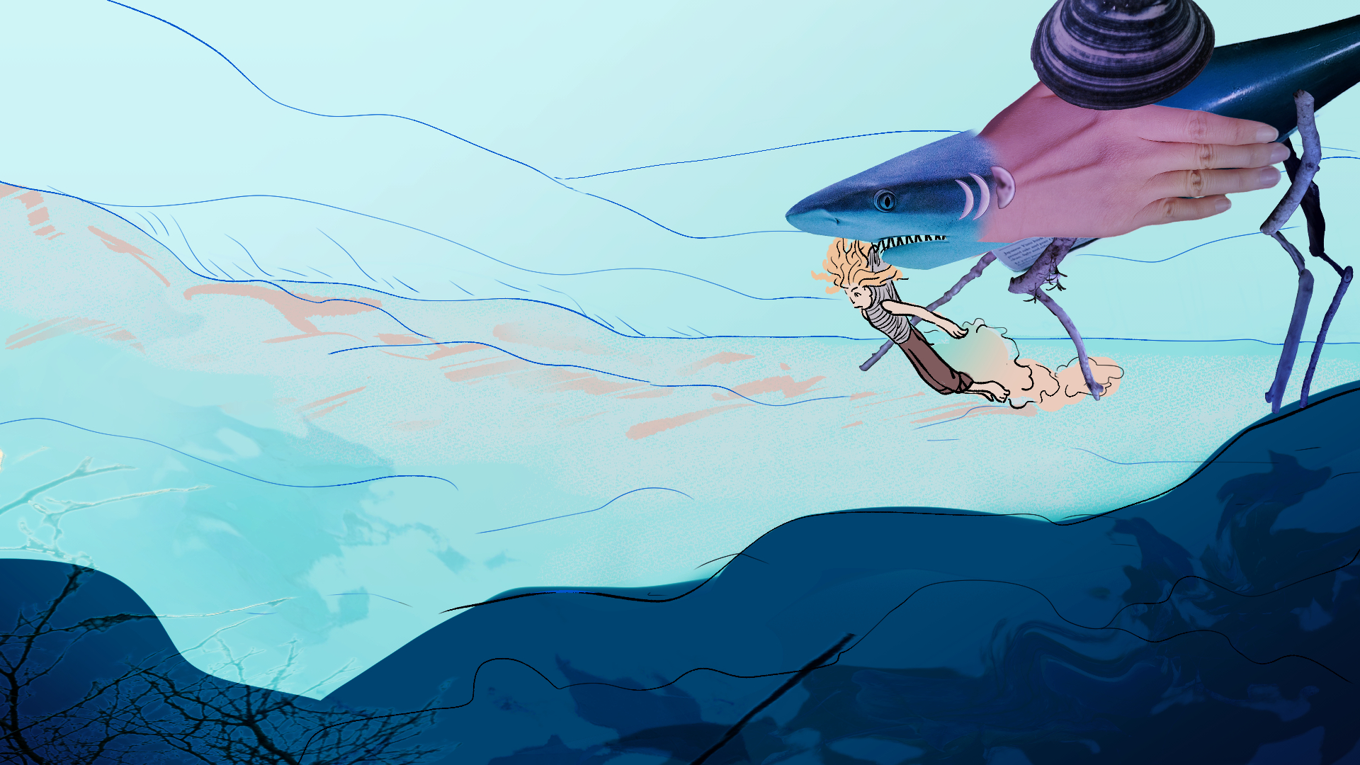 At first, I wanted to keep the cat, so I tried adding more of the surrealistic items so that the cat wouldn’t seem so weird. But later on, while I was making photo-collaged puppets, I created this very cute shark-head character! So I ended up putting this shark-head instead of the cat.